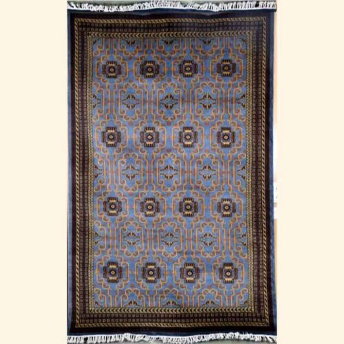 A Wool Carpet Prussian blue encapsulates the essence of Kashmiri craftsmanship, originating from the breathtaking Kashmir Valley in India. These finely hand-knotted oriental rugs boast intricate designs, varying in colors, sizes, and superior quality, making them prized possessions for art enthusiasts worldwide.